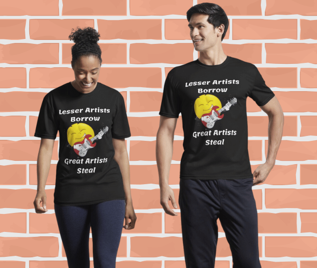 The shirt features the phrase, "Lesser Artists Borrow, Great Artists Steal," a thought-provoking statement often attributed to renowned artists and thinkers. It serves as a conversation starter and reflects a deep understanding of the creative process.